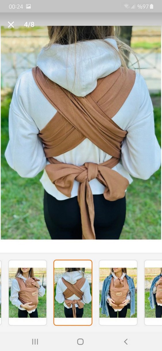 Bu bebek taşıma slingi, sırt kısmında çapraz bağlanan ve rahat destek sağlayan geniş açık kahverengi kayışlara sahiptir. Rahat bir kullanım sunar. Hiçbir sıkıntısı yok. Çok çok az kullanıldı. İsteyene Ürünün direkt fotoğrafını da atabilirim