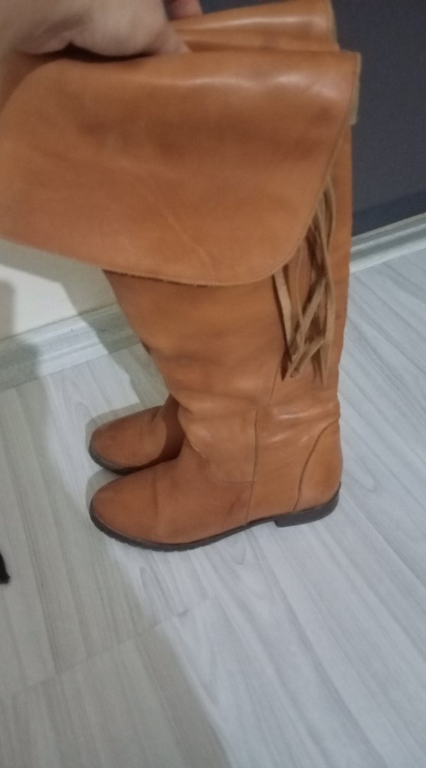Parlak açık kahvarengi hakiki deri diz kismi botlar, hafif topukve püskül detaylara sahip. Bohem tarzıyla günlük şıklığa uygun.cok iyi durumda fazla kullanılmadı