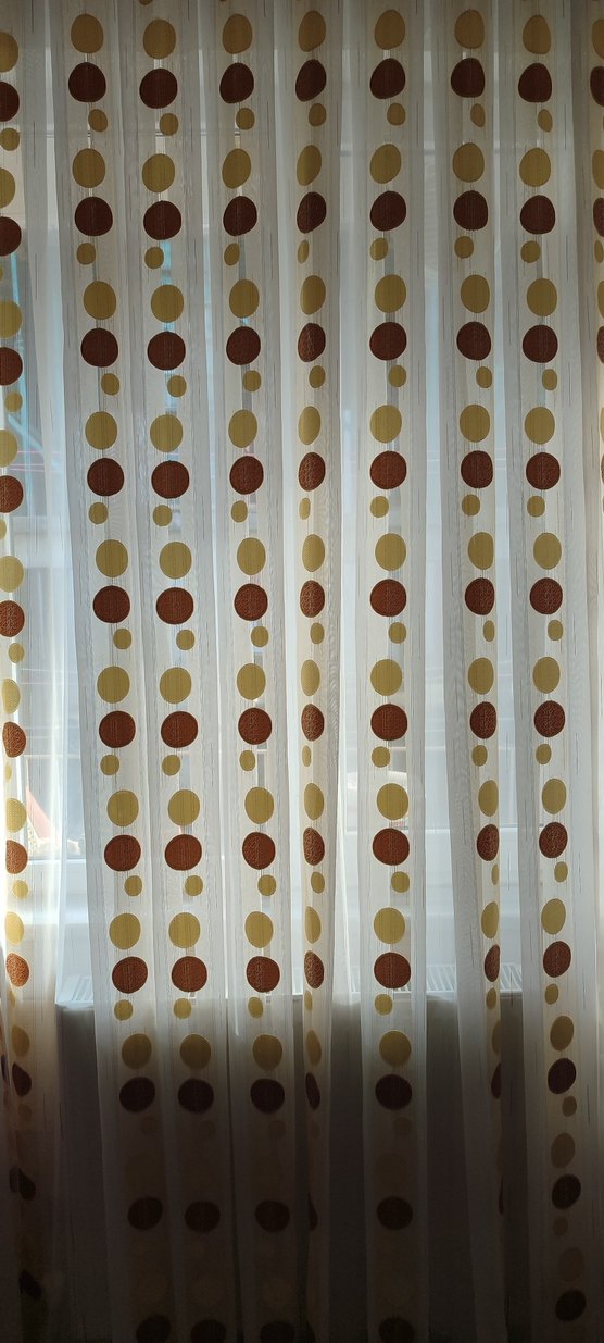 Modern tarzda açık kahverengi puantiyeli tül perde, mekâna hafif ve ferah bir hava katıyor. tek kusuru enini uzatmak için pilelerini kendim diktim ondan uyguna veriyorum 200*260
