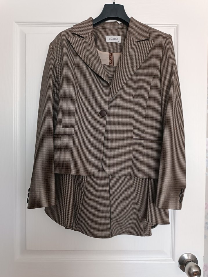 Açık kahverengi , düğmeli ve uzun kollu kadın ofis takımı. Modern klasik tarzda, regular fit ve yakası kesik detaylıdır. 38 beden, ceket uzunluğu 152 cm. etek uzunluğu 60 cm.