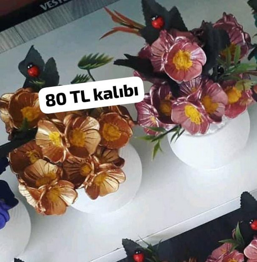 Dekoratif çiçekli açık kahverengi vazo. Fiyat etiketi 80 TL.