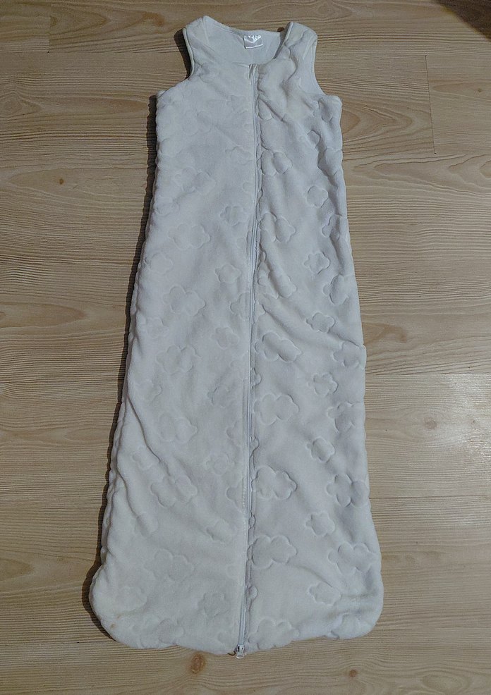 acık krem tonlarında yumuşak ve peluş kumaştan yapılmış, kolsuz çocuk uyku tulumu. Önünde kolay kullanım için fermuar ve hafif dokulu bulut desen bulunur. yurtdısından gelmiştir ve yenidir ..etıket bedenı 110 cm 2 yas ve üzeri içinde uygun