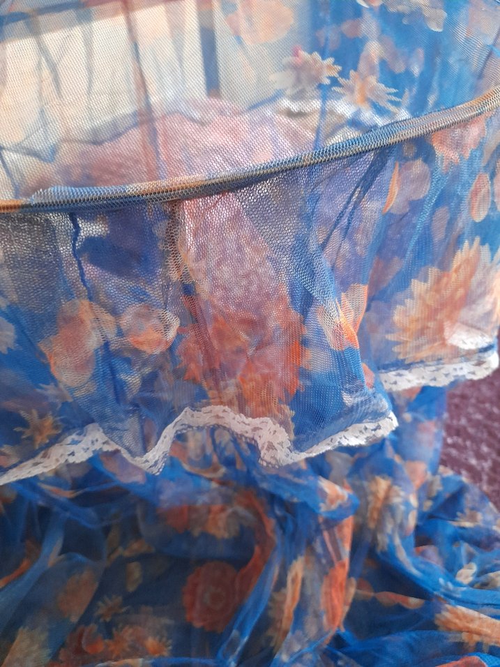 Çiçek desenli, bağlama desenli açık mavi bohem perde, ince dantel detaylı. sıfır hiç kullanilmadi