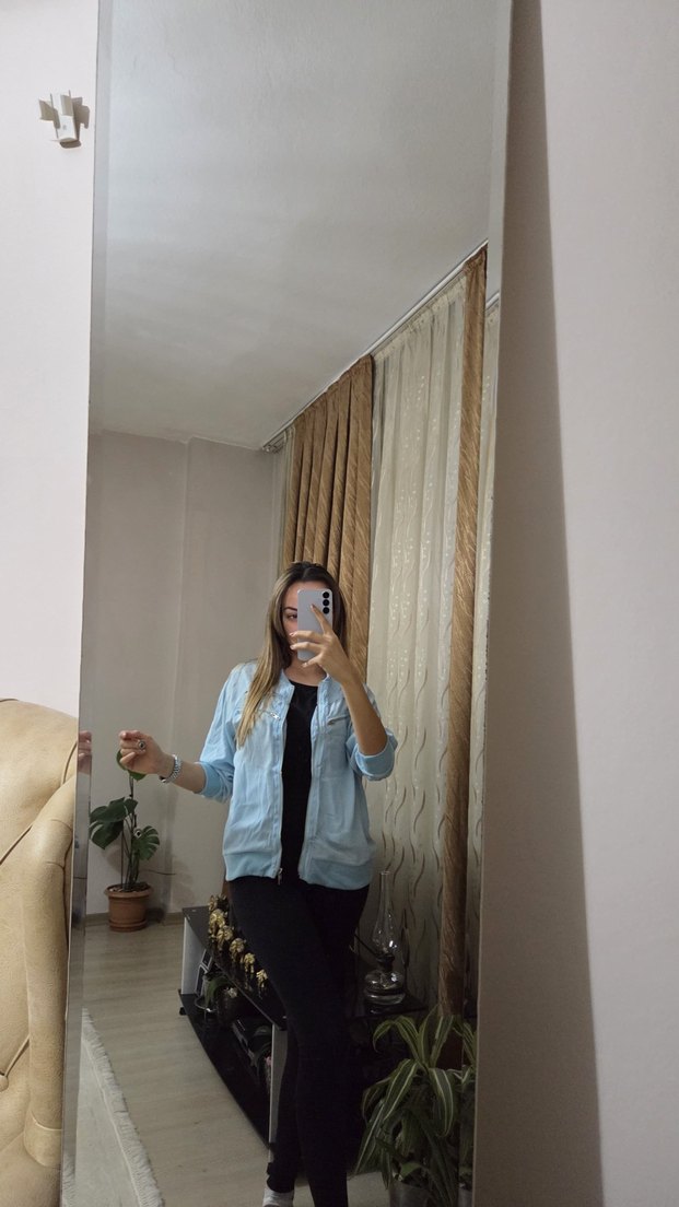 Açık mavi bağlama desenli, bol kesim, uzun kollu ve yakalı denim ceket. Günlük ve sokak stiline uygun.
