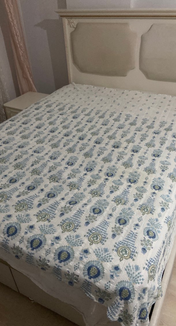 Açık mavi tonlarda, batik desenli ve zarif çiçek motifleriyle süslenmiş yatak örtüsü, yatak odasına yumuşak bir dekoratif dokunuş katıyor. ️