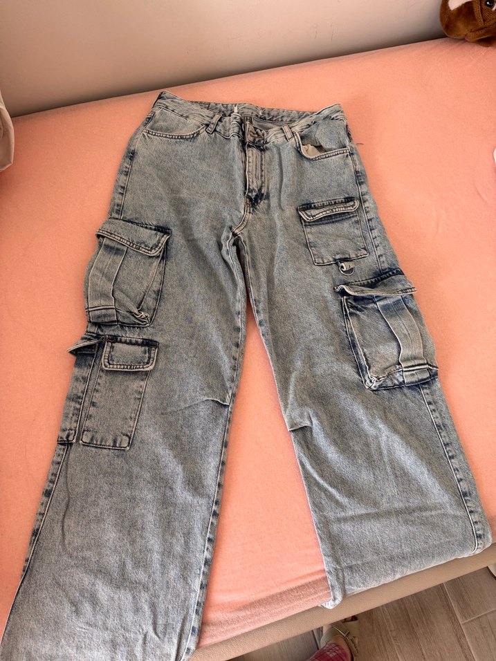 Açık mavi renkli, bol kesim kot pantolon, çoklu kargo cepleri detayıyla günlük rahat kullanım için uygundur. Midi boy ve desensiz tasarıma sahiptir.