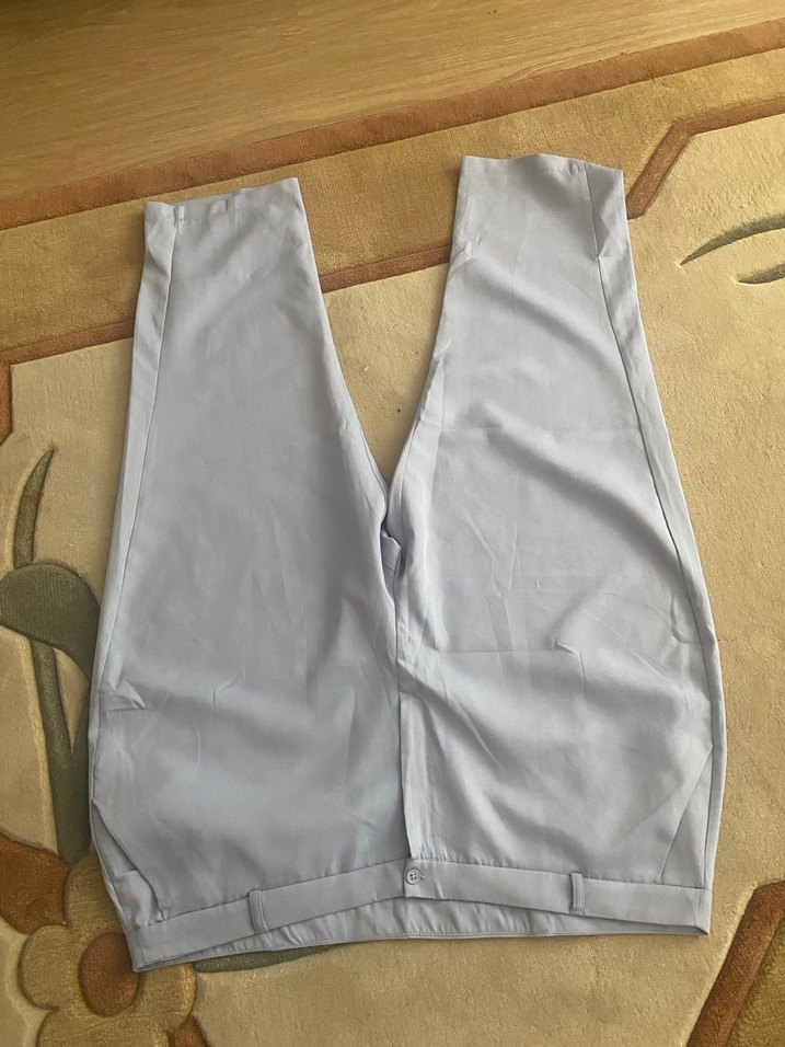 Mavi gri karışm renkte büyük beden , düz desenli kadın midi kumaş pantolon. Rahat kesimi ve yumuşak sentetik kumaşıyla günlük kullanım için minimal ve sade bir tasarıma sahiptir. Bel 60 basen 76 uzunluk 105 cm yeni hiç kullanılmamış marka temsilidir