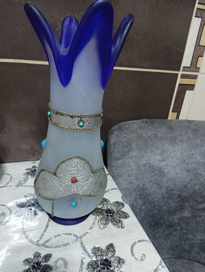 Açık mavi renkte, özgün şekilli ve küçük turkuaz detaylı gümüş süslemeli dekoratif vazo.