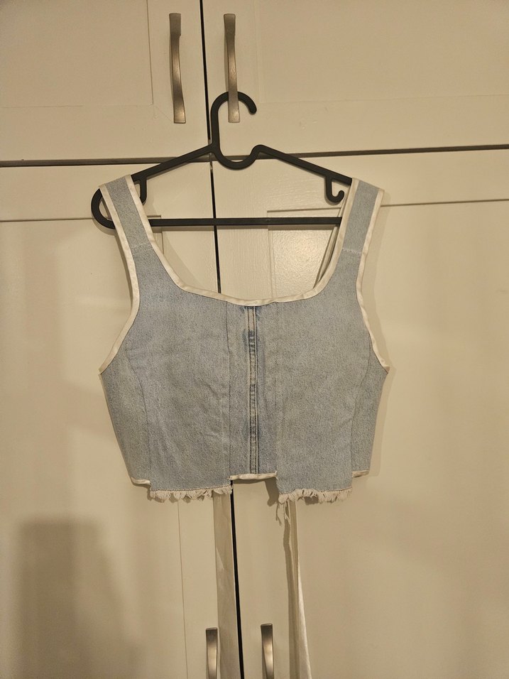 Kendi tasarlayıp diktiğim ,açık mavi denim kumaştan, askılı ve normal boyda, trend sokak stili için uygun, vücuda oturan kadın korse bluz
