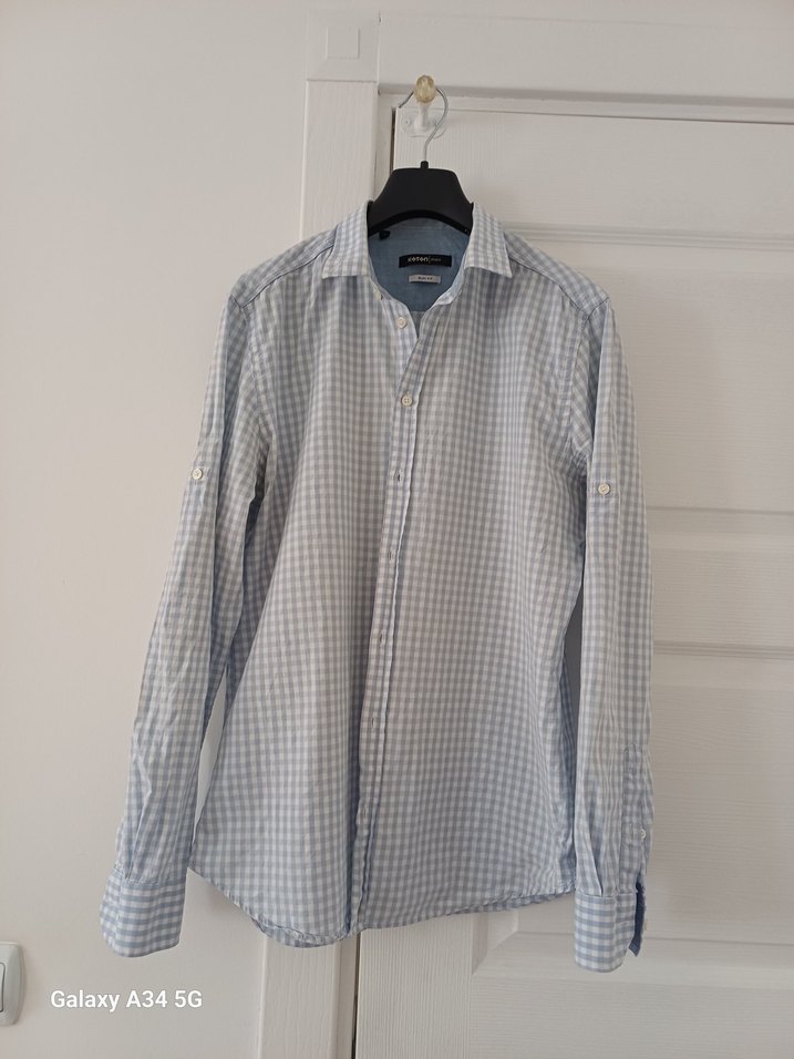 Açık mavi renkte, düğmeli, uzun kollu ve regular fit erkek gömleği. Pamuk kumaştan üretilmiş, günlük ve sokak stiline uygun.