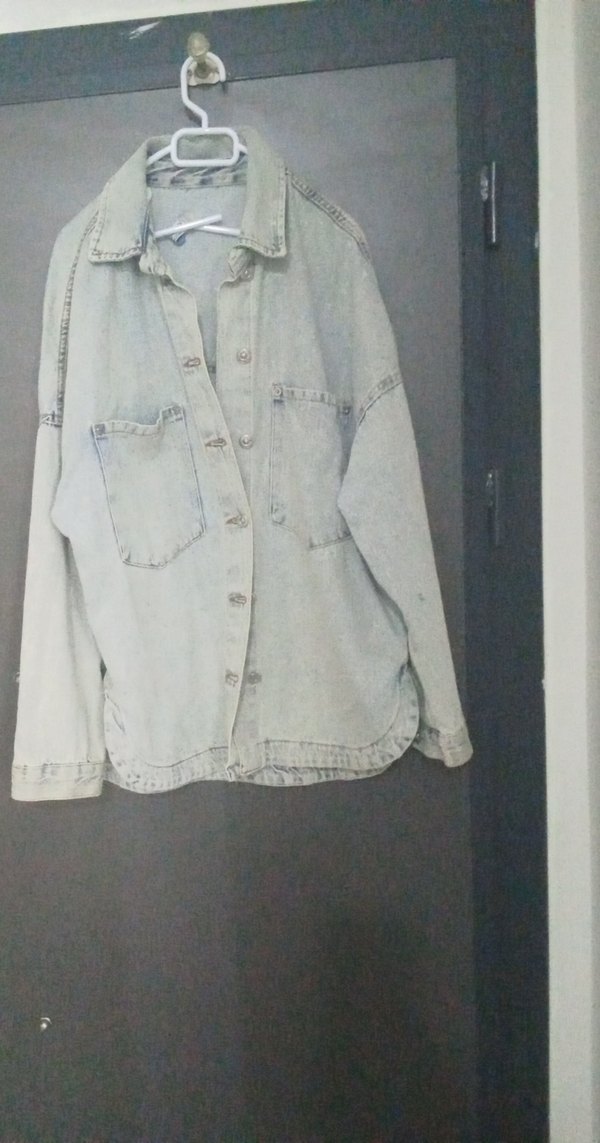Düğmeli, uzun kollu, mavi kadın kot ceket.