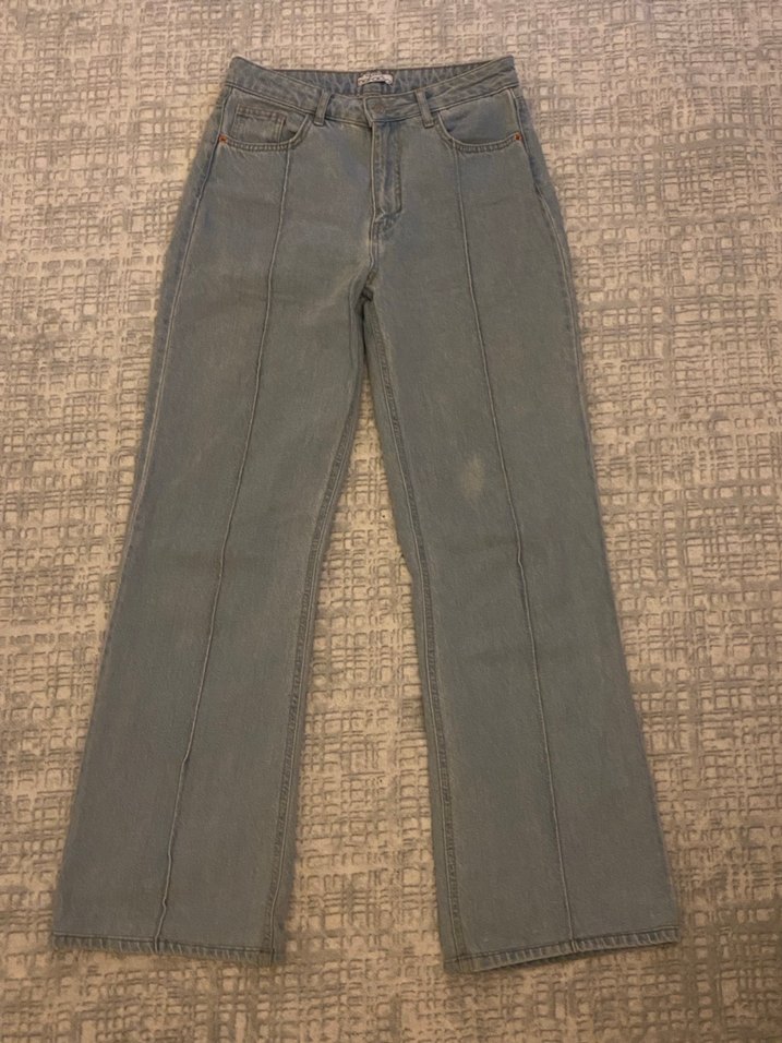 Açık mavi renkli, bol paça kot pantolon, günlük rahat stil için uygundur. Desensiz sade tasarıma sahiptir.