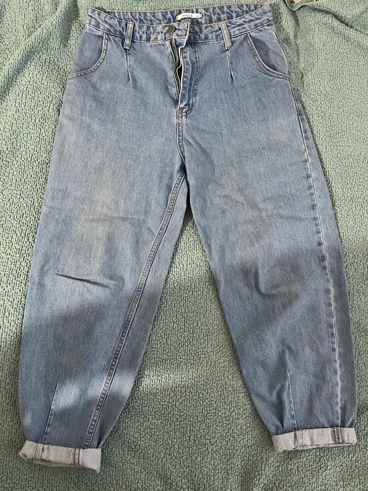 Açık mavi tonlarda, bol kesim (mom jean gibi) ve normal boyda denim kadın jean.