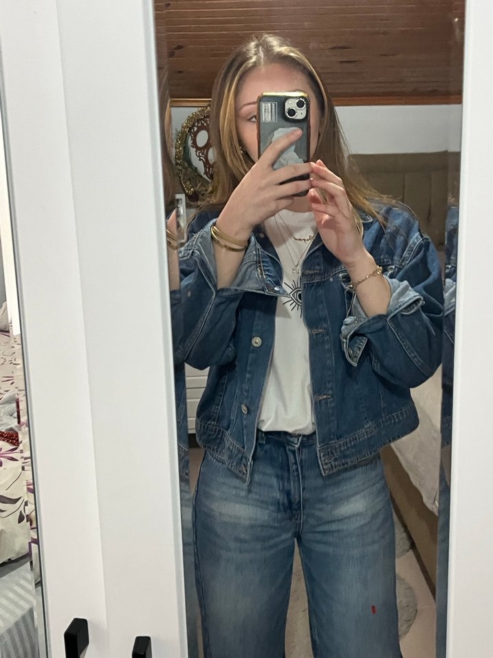 Açık mavi renk, bol kesim ve yaka detaylı kadın denim ceket. M beden kısa koton kot ceket
