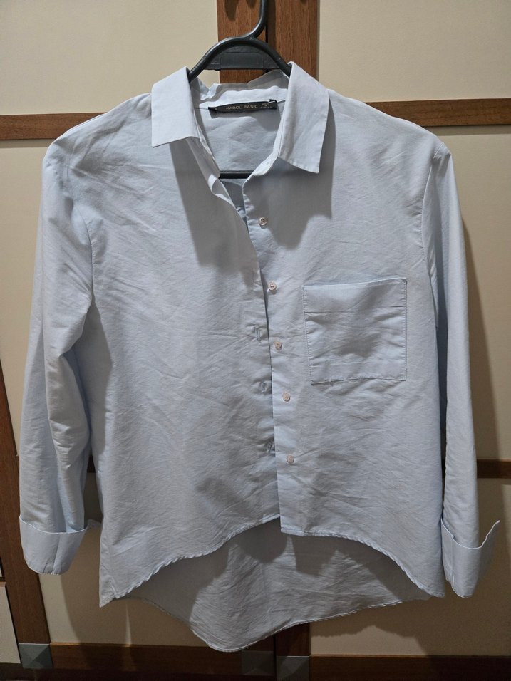 Düğmeli, yakalı, uzun kollu açık mavi gömlek, rahat kesimiyle günlük kullanım için uygundur.