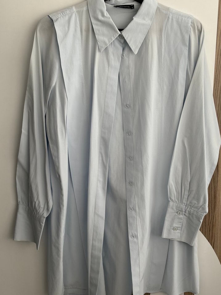 Açık mavi renkli,poplin yapılmış kadın gömleği. Düğmeli, yakalı ve uzun kollu. Normal midi boy ve bol kesim, ofis kullanımı için sade ve iş tarzında.