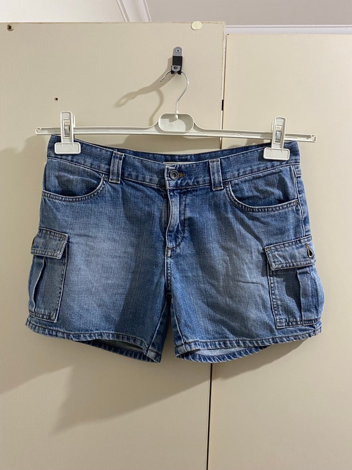Açık mavi kot kumaştan, kemerli ve bol kesim şort. Mini boyda, yan cepleriyle rahat ve günlük dış mekan kullanıma uygun.