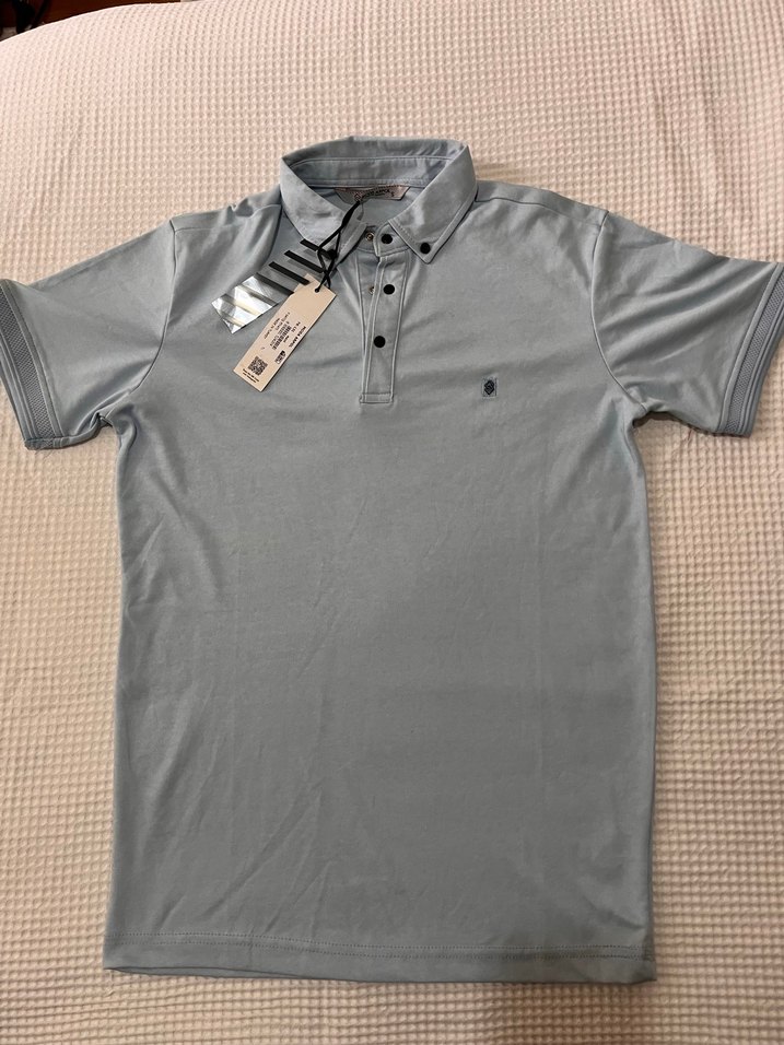 Düğmeli yakalı ve kısa kollu, düz mavi renkte erkek polo tişört. Rahat kesimi ve sentetik kumaşıyla günlük sokak stiline uygun.