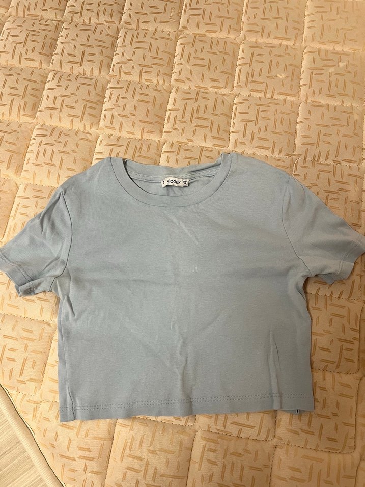 Açık mavi renkte, pamuk kumaştan yapılmış, kısa kollu ve bisiklet yaka, vücuda oturan kadın tişörtü. Minimalist ve günlük kullanıma uygun sokak stili tişört.