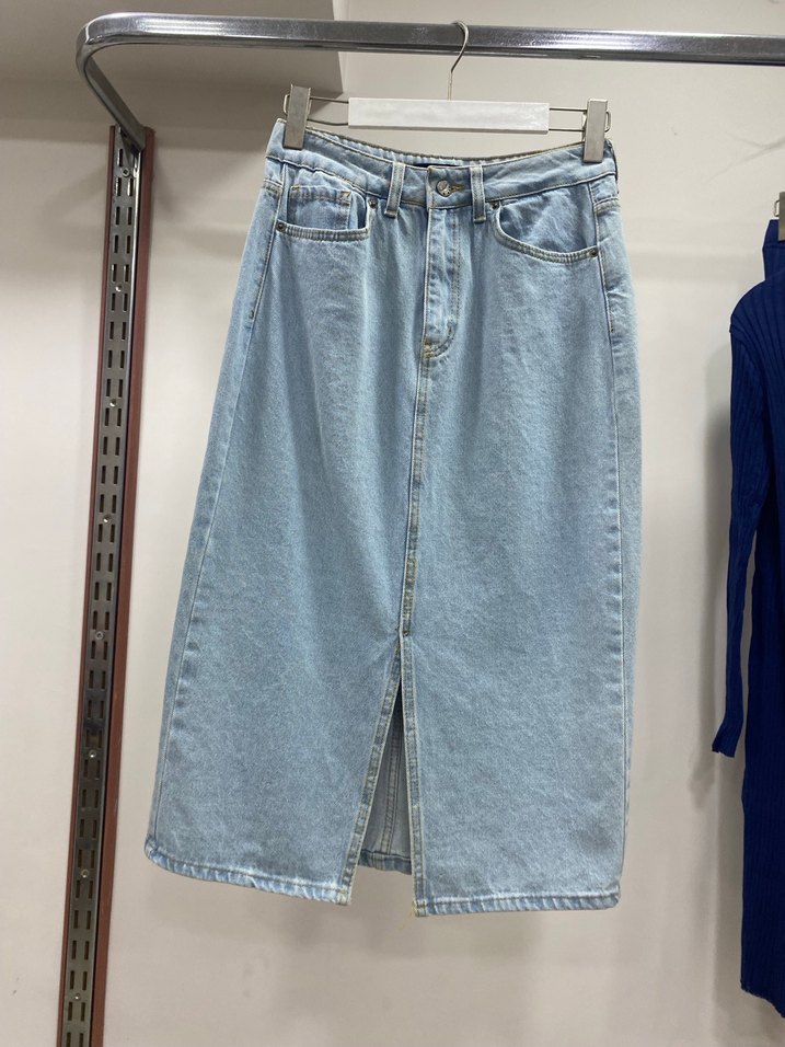 Açık mavi kot midi etek, bel detaylı ve ön yırtmaçlı, rahat kesimiyle günlük kullanıma uygundur.