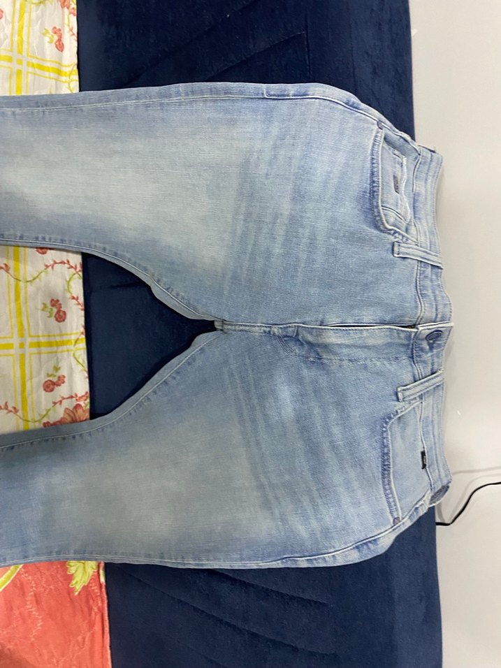 Açık mavi tonlarında, bol kesim, tokalı detaylı midi uzunlukta erkek kot pantolon, günlük rahat stil için uygundur. Hiç giyilmedi