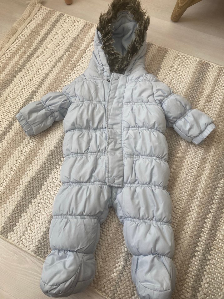 Gri renkte, kapüşonunda kürk detaylı, yumuşak ve sıcak kumaştan yapılmış erkek bebek tulumu. Desensiz ve normcore tarzda. Marka temsilidir.