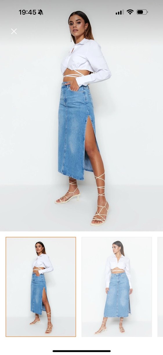 Açık mavi renkte, midi boyda, yan yırtmaçlı, bol kesim denim etek. Günlük kullanıma uygun rahat ve şık bir tasarım.