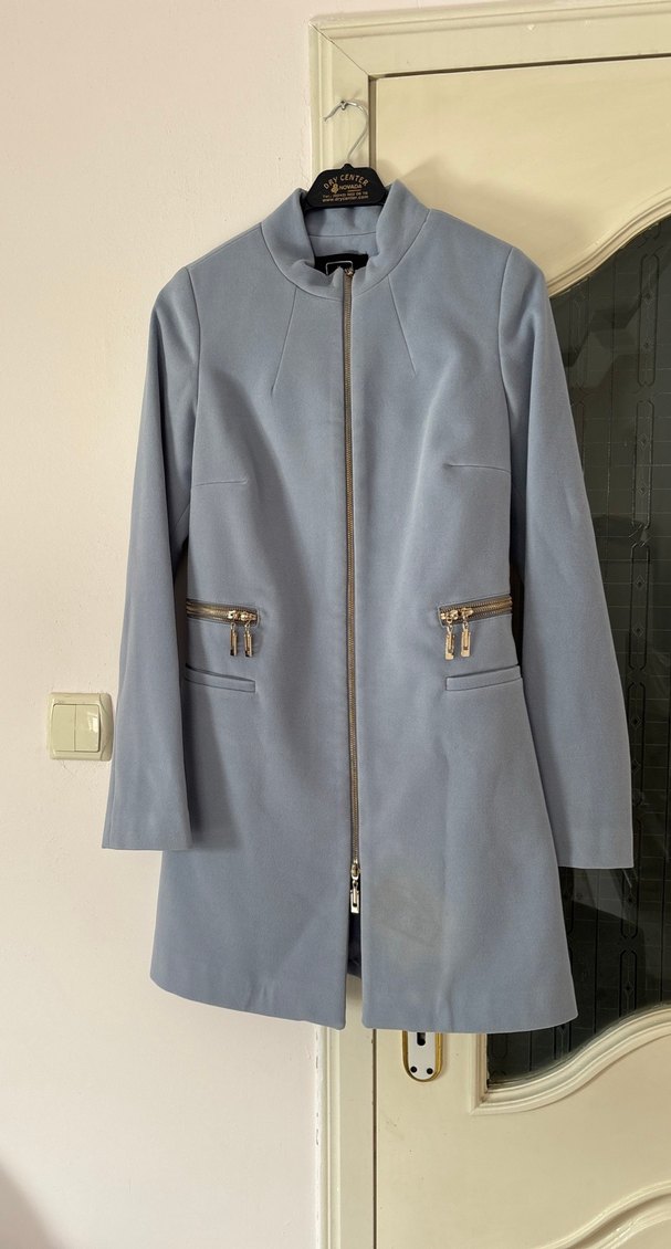 Gri süet kumaştan, çıtçıtlı yakalı ve fermuarlı önden kapanışlı midi uzunlukta kadın kaban. Uzun kollu ve düzenli kesim, ofis ve iş ortamına uygun. Fermuarlı cepleri bulunur, desensiz sade tasarım klasik şıklık sunar.