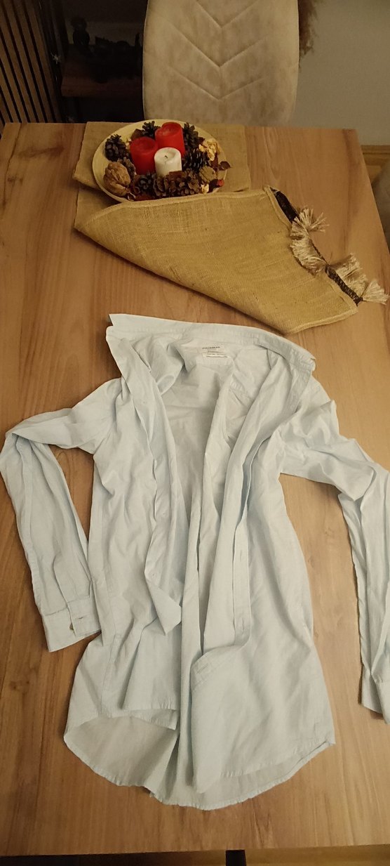 açık mavirenkte keten kumaştan midi uzunlukta, düğmeli ve salaş kesim hamile ceketi. Uzun kollu, yakalı ve günlük sokak stili için uygun.