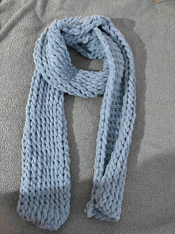 Açık canlı mavi renk el örgüsü atkı. En fazla 3-4 kere kullanmışımdır, en son da yıkayıp yerleştirdim zaten.