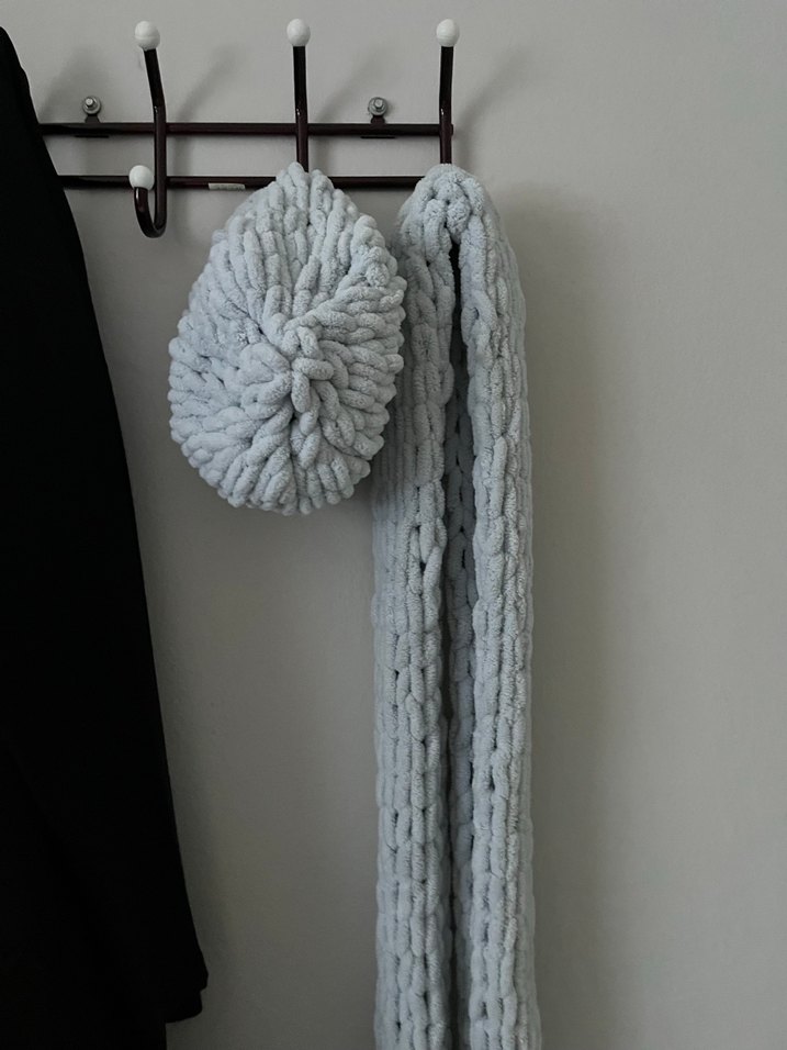 Kalın örgü desene sahip açık mavi renkte, sıcak ve rahat tutan kadın atkı ve bere el yapımıdır.