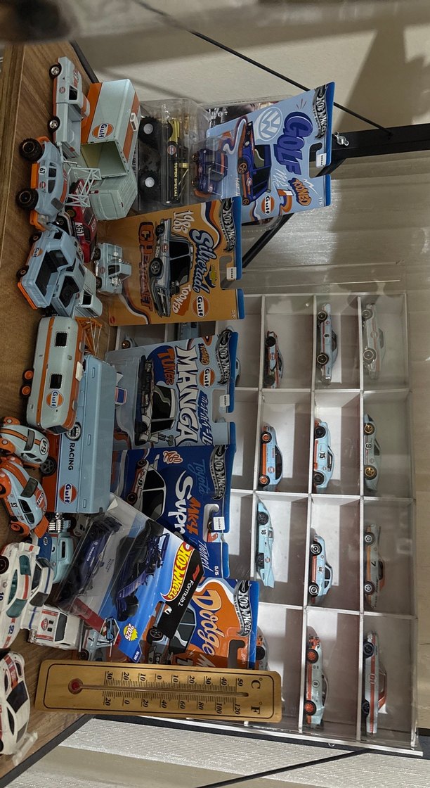 50 adetten fazla gulf koleksiyon ciddi alıcılara detaylı resim atılır Farklı boyut ve modellerde açık mavi oyuncak arabalar, kutularıyla ve raflarda sergileniyor.