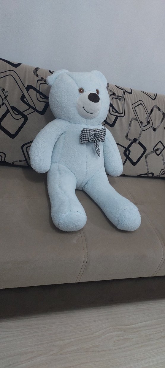 Yumuşak kumaştan yapılmış, ekose fiyonk detaylı, yaklaşık 80 cm uzunluğunda büyük açık mavi peluş ayı oyuncak.