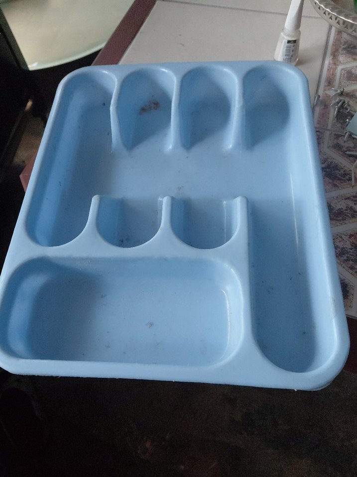 Çatal, bıçak ve kaşıkları düzenlemek için çok bölmeli açık mavi plastik çatal kaşık düzenleyici. Dayanıklı ve temizlemesi kolay. yeni ama kirli