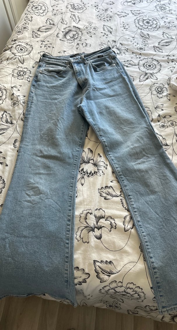 Açık mavi renkte, rahat kesim kadın İspanyol paça kot pantolon, gündelik kullanıma uygun sade ve desensiz tarzda.