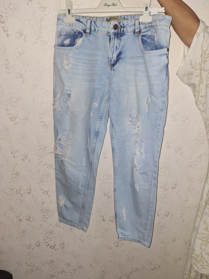Açık mavi denim kot pantolon, rahat kesim ve yırtık detaylara sahip. Tokalı bel ve midi boy, günlük sokak stili için uygun.