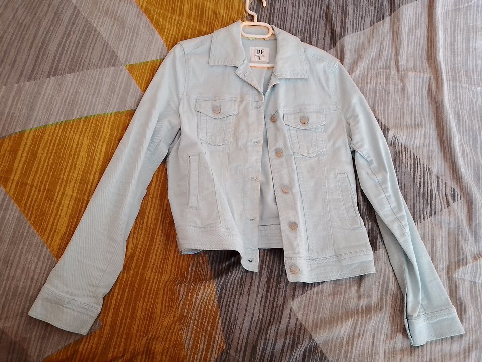 Açık mavi renkte, düğmeli, notalı yaka ve uzun kollu kot ceket. Normal kesim, midi boy, desen içermeyen rahat günlük stil.