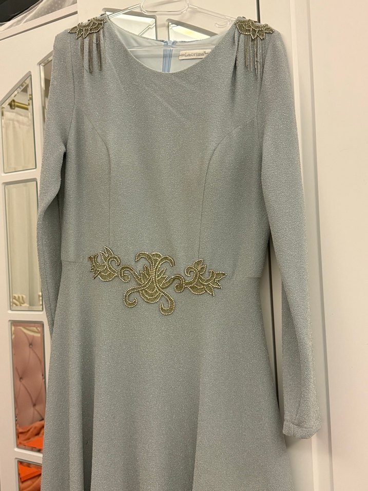 Uzun kollu, bisiklet yaka açık mavi abiye elbise, omuz ve bel kısmında zincir işlemeleriyle klasik ve modern bir duruş sunar. Düğünler için uygundur.