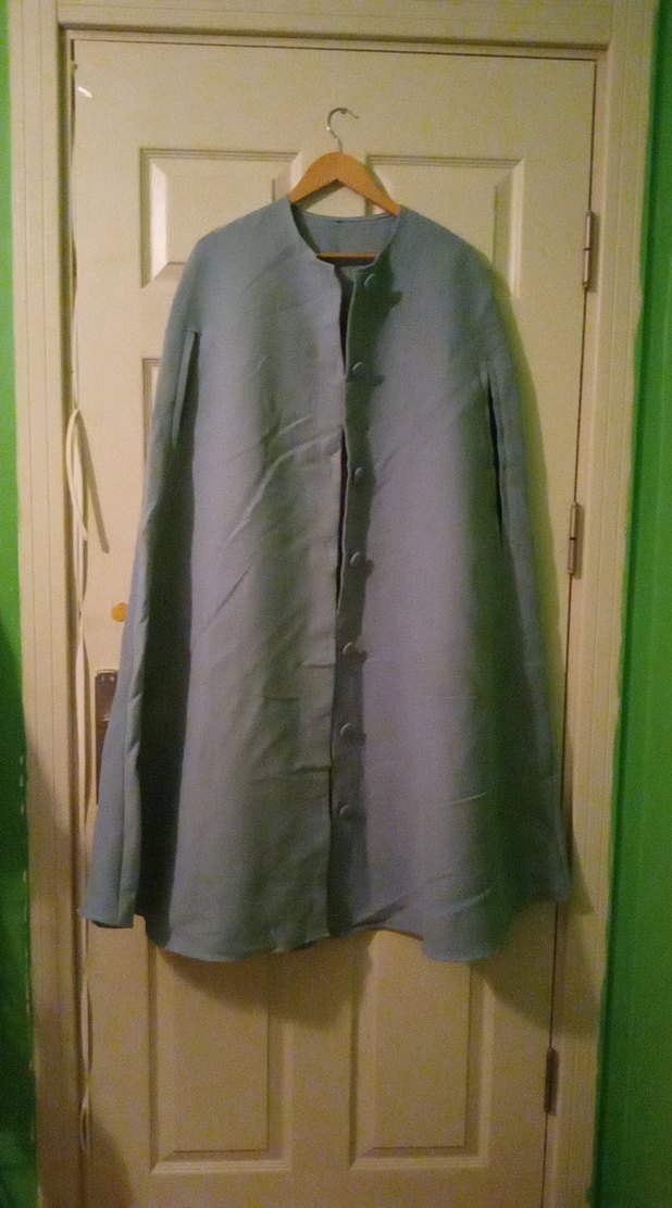 Açık mavi uzun keten kaban, düğmeli ve kesik yaka detayıyla. Uzun kollu ve bol kesim, şık ofis kombinleri için uygun. Az kullanıldı. Dolapta katlı durumda olduğundan kırışık duruma gelmiş. Ütüleyip gönderebilirim.