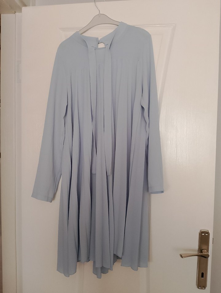 acık mavi uzun kollu keten tunik, drapeli tasarım ve yüksek yakaya sahiptir. Rahat kesimi ve minimalist tarzıyla ofis kullanımı için uygundur.