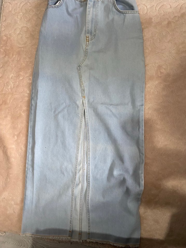 Açık mavi renkte, yırtmaçlı ve vücuda oturan uzun kot etek. Desensiz, günlük rahat kullanıma uygun. Son eklediğim fotoğraf temsili üstümde fotoğrafı olmadığı için nasıl durduğunu göstermek amacıyla koydum etiketi yok ama hiç giyilmedi.herhangi bir sıkıntısı yok 173 56 kiloyum tam oluyor