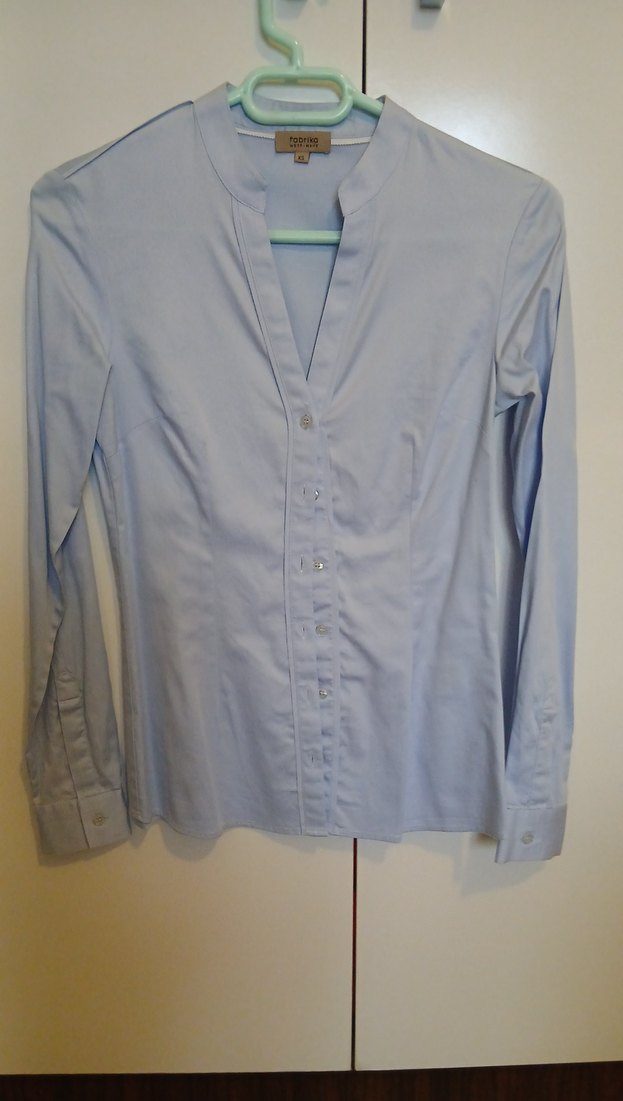 Mavi pamuk kumaştan, V yaka ve düğmeli ön detaylı, uzun kollu, normal kesim şık kadın gömleği. Ofis için uygun, pastel tonu ile trend ve normcore tarzı yansıtıyor.