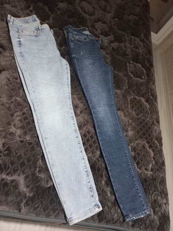 açik mavi ve mavi tonlarında, midi boy, dar kesim kadın jean pantolonlar. Desensiz tasarımıyla rahat ve şık sokak stili sunar.