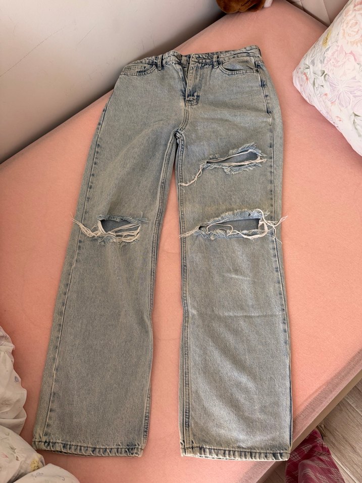 Açık mavi renkli, yırtık detaylı, midi boy, bol kesim kadın kot pantolon. Rahat ve günlük kullanıma uygun. Katlanma izi var çok belli olmuyor ama 2.görselde ekledim