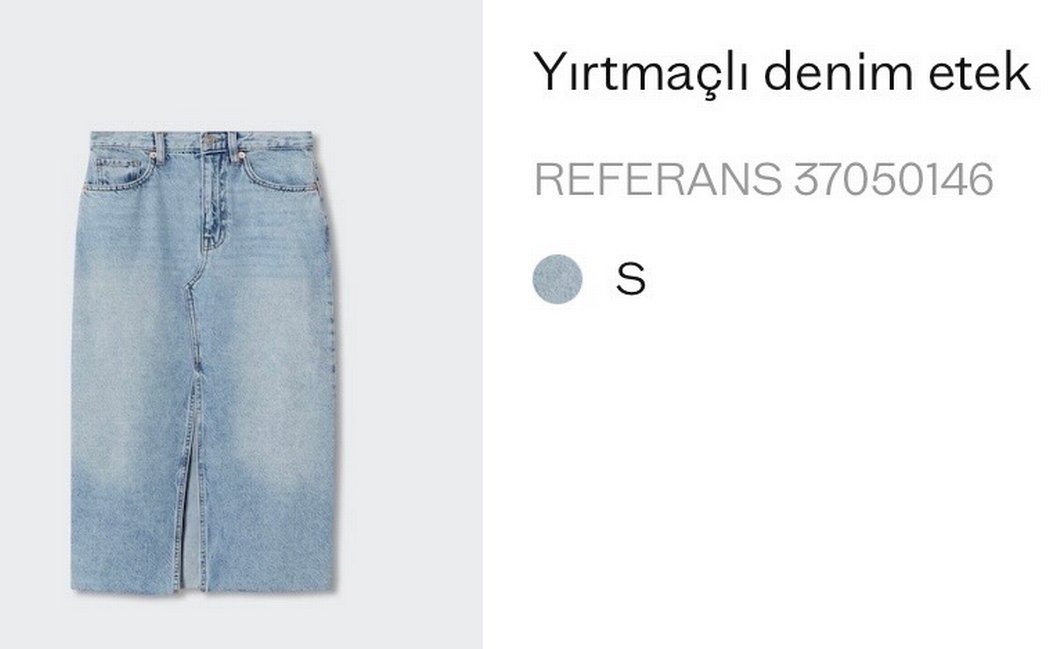 açık mavi renkte, midi boy yırtmaçlı denim etek, rahat ve şık bir tarz sunar.