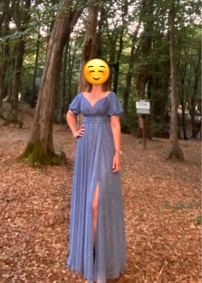 Bir defa giyindim. Temiz, kolları omuza indirilebilir yırtmaçlı abiye