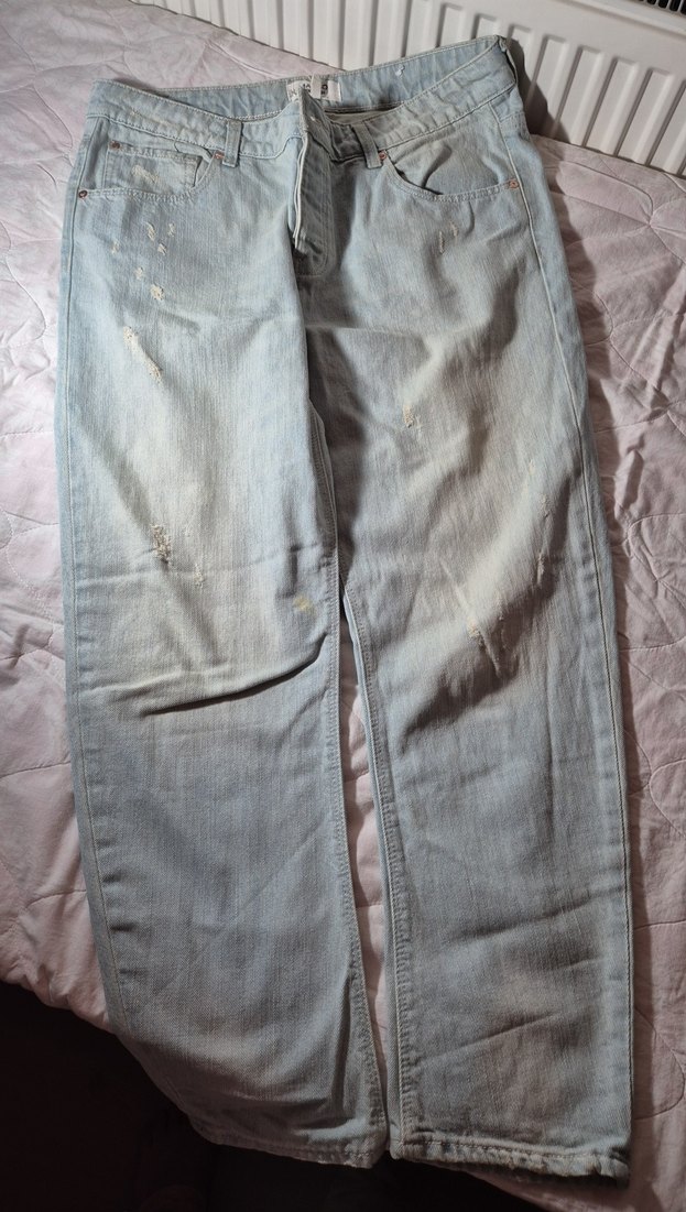 açıo mavi renkte, düğmeli, rahat kesim kadın kot pantolon. Normal midi boyda, günlük ve sokak stili için uygun.bacak kısmında küçük leke var ekledim fotoğraflara