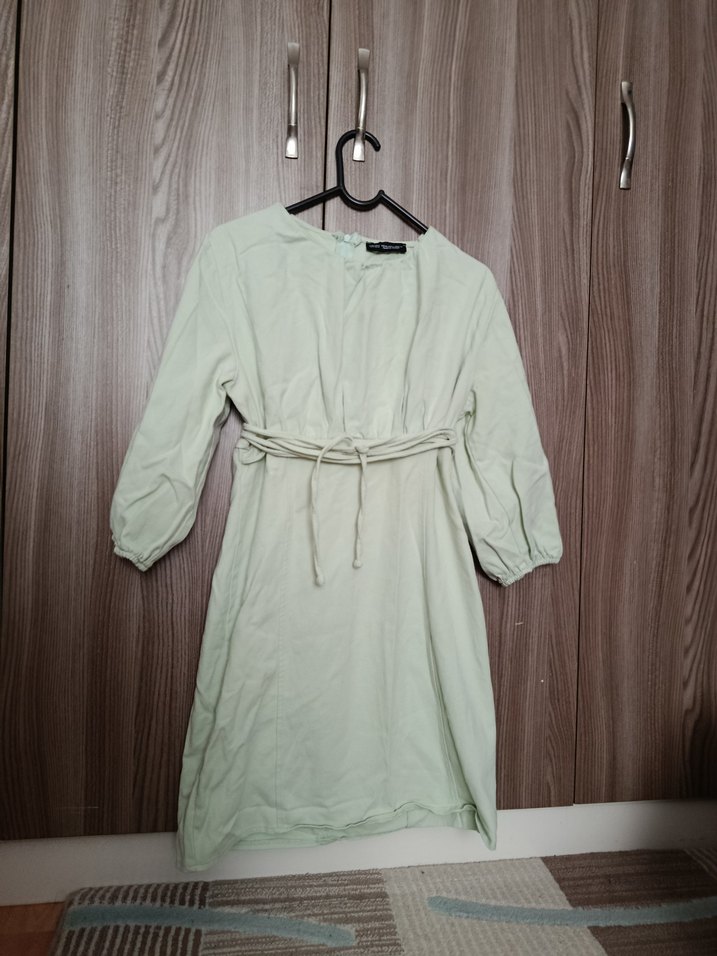 Açık mint renkli, keten kumaştan midi uzunlukta, kemerli ve salaş kesimli bir elbisedir. Uzun kollu ve sade, minimalist tarzda günlük kullanıma uygundur.