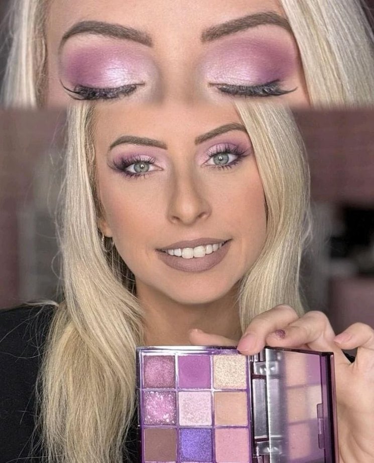 Çeşitli ton ve dokularda açık mor göz farı paleti, farklı makyaj stilleri için uygundur.