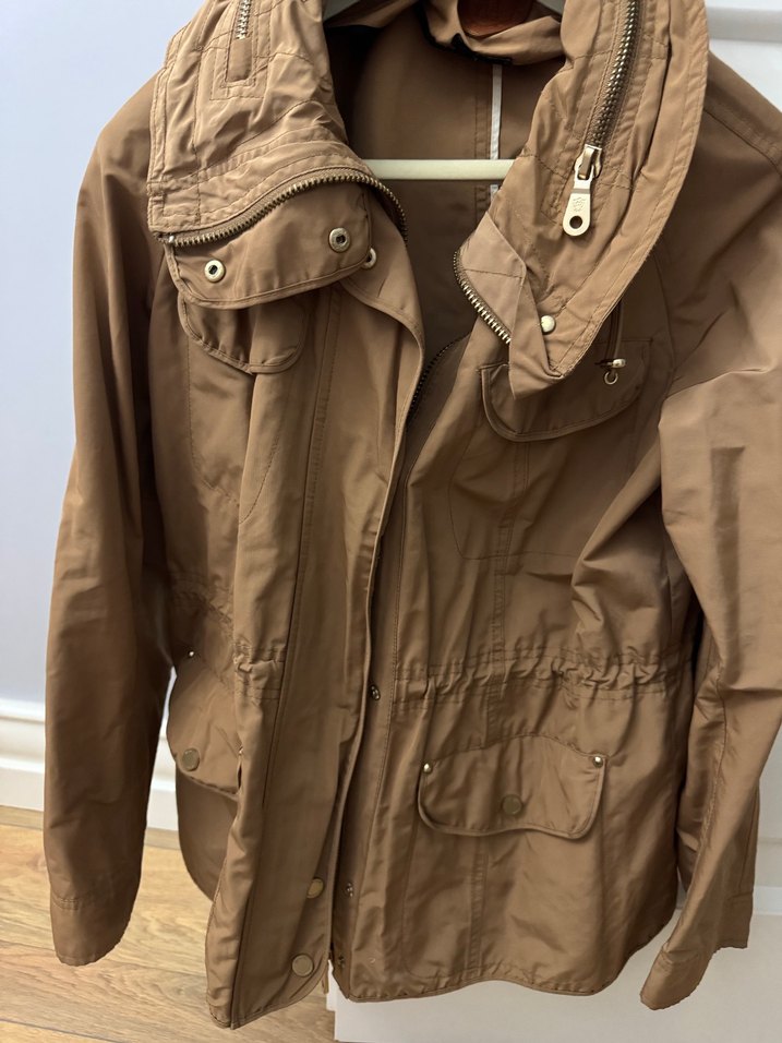 Parlak kahverengi,fermuarlı, uzun kollu, yaka detaylı ve bol kesim midi ceket. Sokak stiline uygun.tek kolunda minik bi leke var ancak tek kat kıvırıp kullanınca görünmüyor bu sebeple fiyat oldukça uygundur